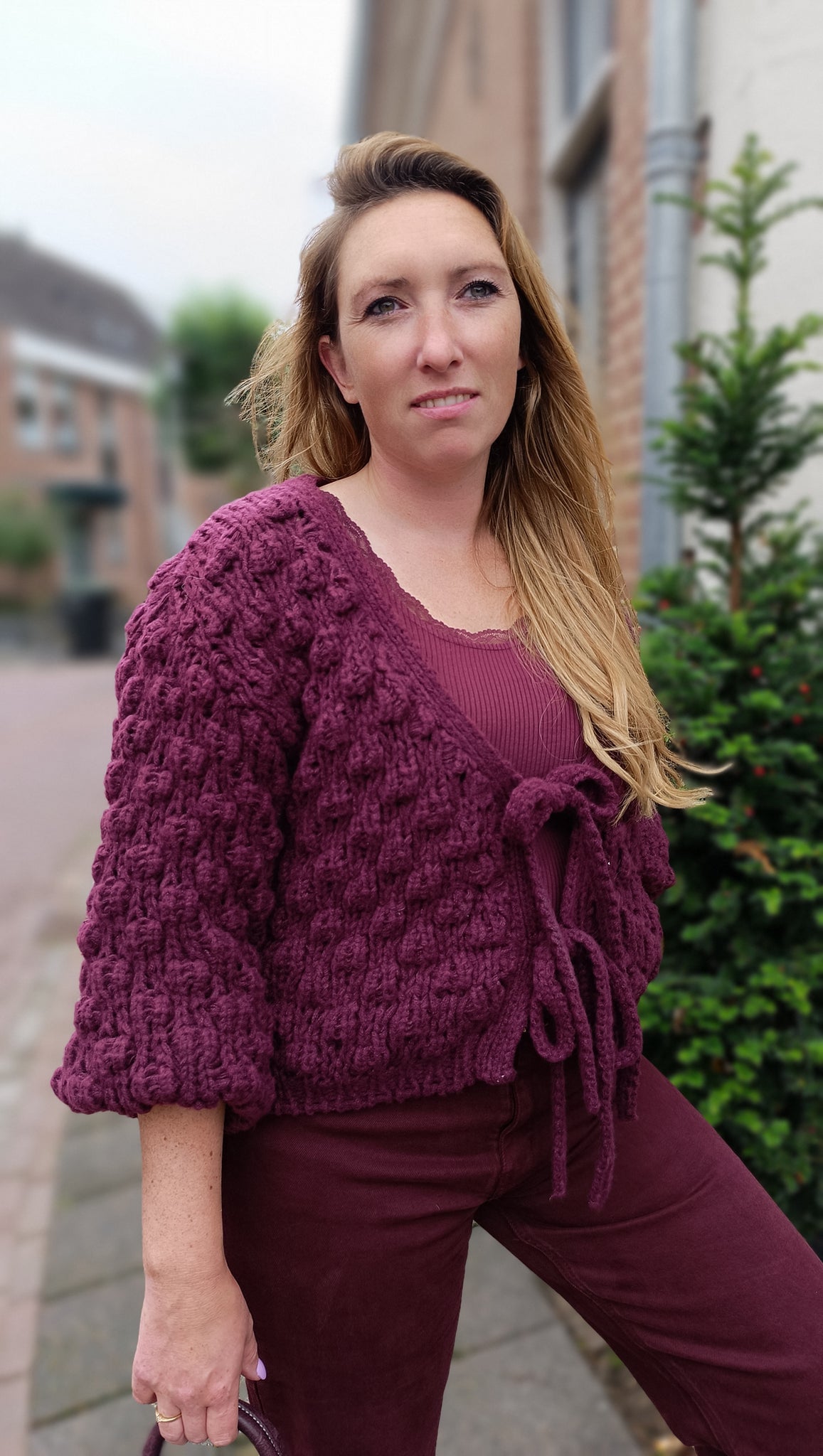 Dik gebreid bordeaux rood vest met strikkoord 100 % acryl
