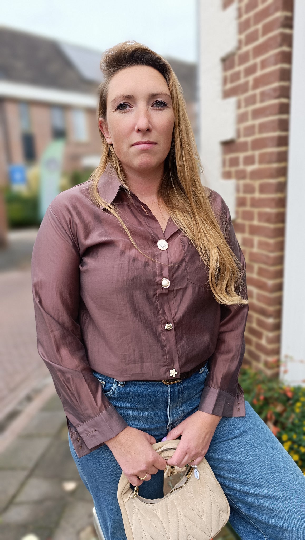 Bruine blouse van voile katoen . leuk detail zijn de verschillende knopen.