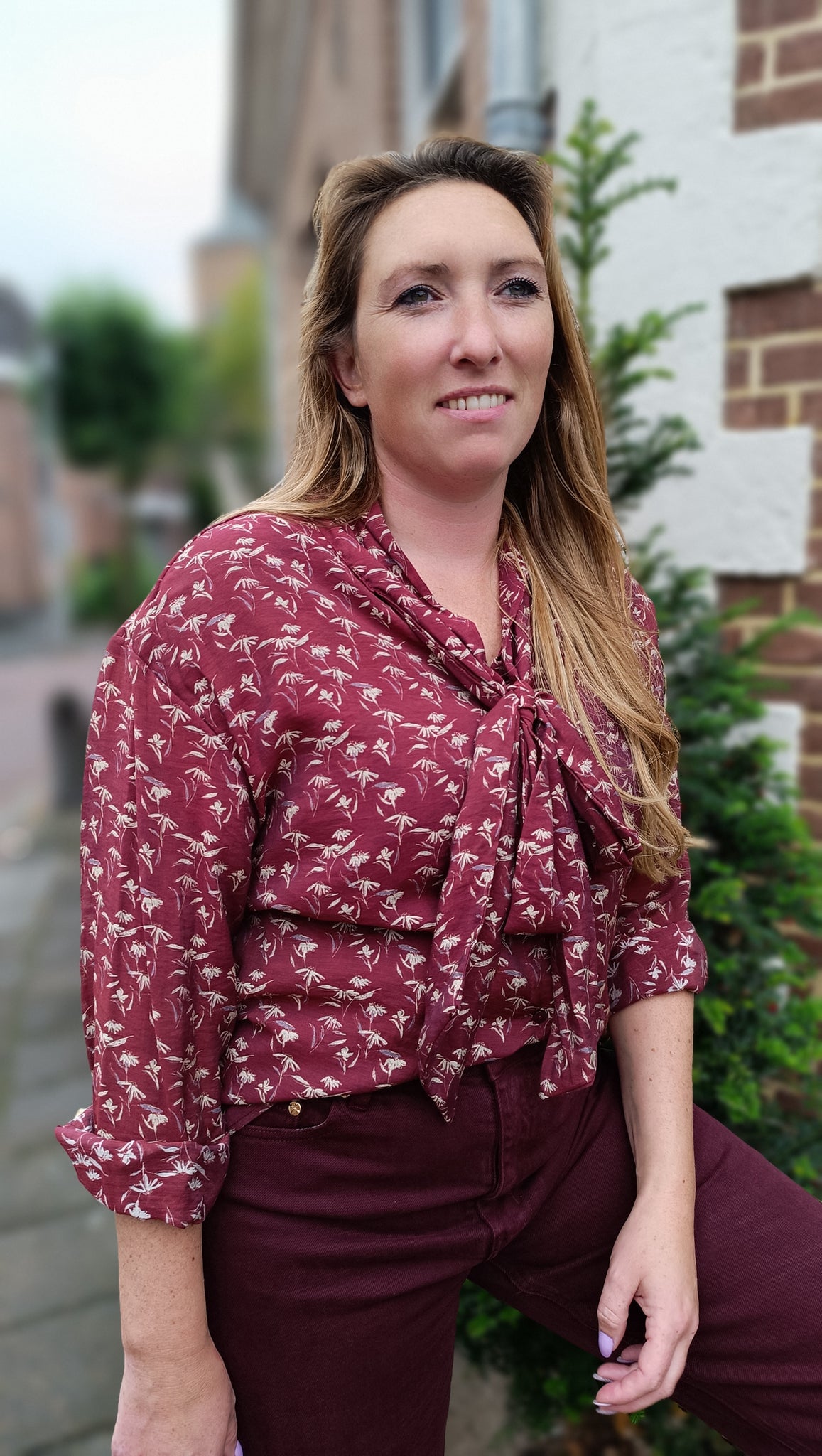 Bordeaux rode blouse met een fantasie printje , en sjaal strik