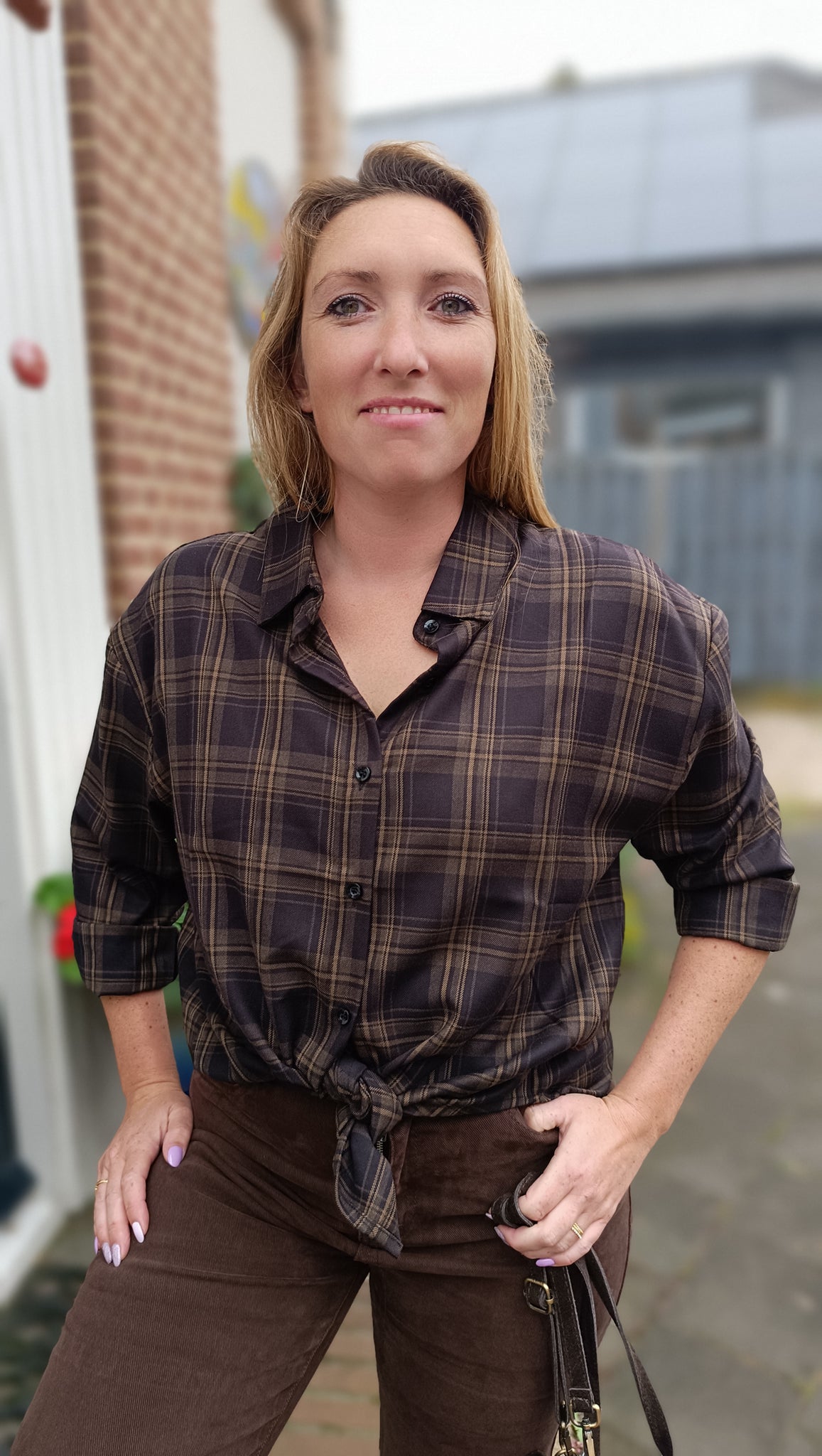 Geruite blouse in bruin/zwart , achterkant iets langer 1 maat , valt tm ruime maat...