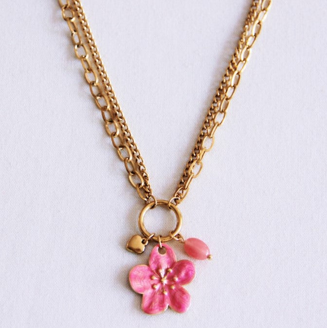 Dubbele schakel ketting met bloem, hart en natuursteentje. Stainless steel 39 cm + 5 cm...