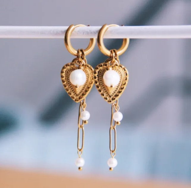 Creool met hartje , parel en parelkettinkje Stainless steel 6 cm