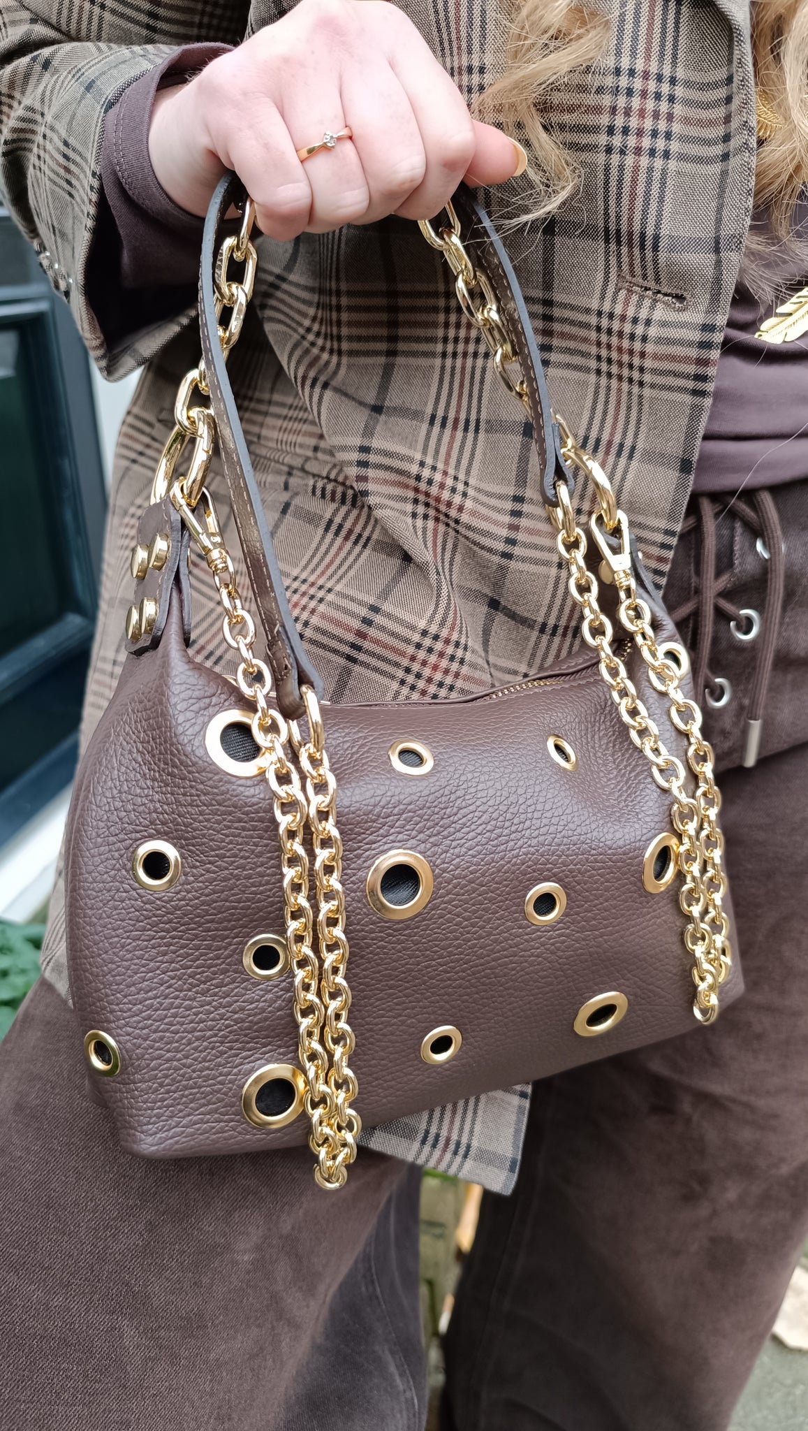 Choco bruine tas met nestels Kort en lang hengsel, deels goudkleurige schakel ketting Binnen vakje...